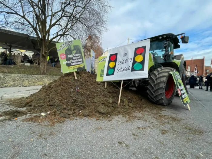 Seit dem Morgen hatten Bauern in Biberach demonstriert und den Verkehr blockiert. Auf den Zufahrtsstraßen zur Stadthalle befanden sich viele Traktoren. Vor der Halle wurde eine große Menge Mist abgeladen. Man konnte lautes Hupen und Musik hören.