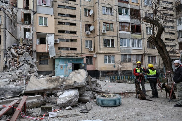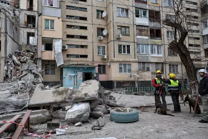 Die Rettungskräfte suchten nach dem Drohnenangriff weiterhin in den Trümmern nach Verschütteten. Nach Angaben der Behörden wurden mindestens 18 Wohnungen zerstört.