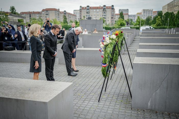 Zum Beginn seines zweiten Besuchstages in Deutschland hat der französische Präsident Emmanuel Macron der vom nationalsozialistischen Deutschland ermordeten Juden Europas gedacht. Zusammen mit Bundespräsident Frank-Walter Steinmeier besuchte er am Montagmorgen in Berlin das Holocaust-Denkmal unweit des Brandenburger Tors.