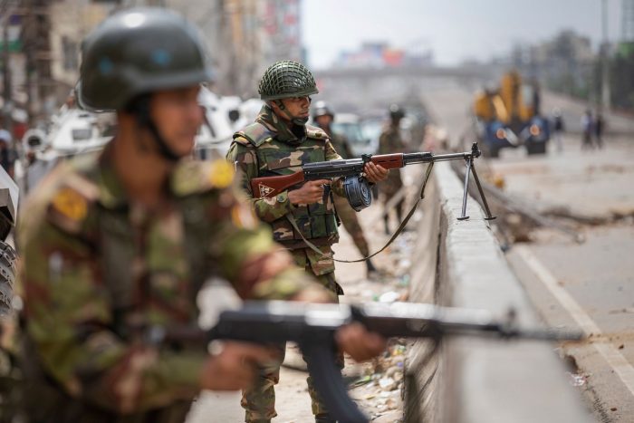 Seit Freitag um Mitternacht gibt es im Land eine Ausgangssperre, und die Armee ist landesweit im Einsatz. Trotzdem gab es laut BBC Bangla auch am Samstag vereinzelte gewaltsame Zwischenfälle. Heute sollte die Ausgangssperre zwischen 15 und 17 Uhr (Ortszeit) gelockert werden, damit die Menschen wichtige Besorgungen machen können.