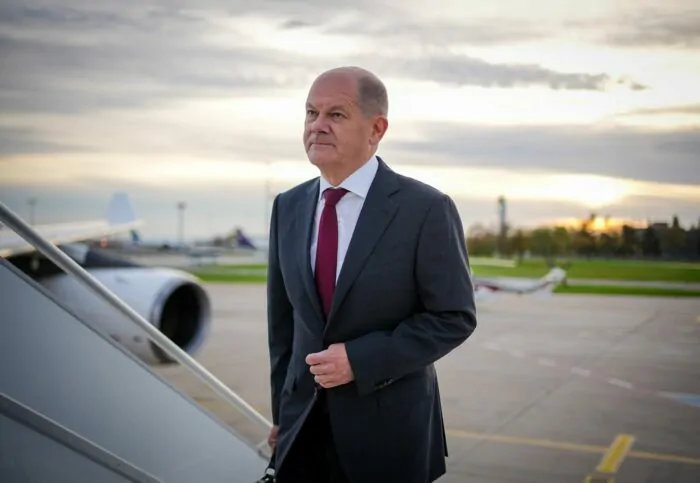 Es ist ein sehr spezieller Empfang, der Bundeskanzler Olaf Scholz am Flughafen von Peking bereitet wird. Menschen in weißen Schutzanzügen rollen den roten Teppich vor seiner Regierungsmaschine aus. Bis er ihn betreten kann, dauert es jedoch ein paar Minuten.