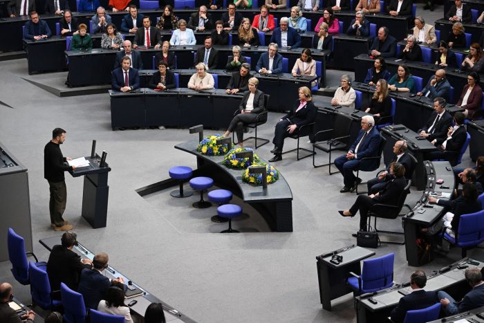 Selenskyj hatte am 17. März 2022, drei Wochen nach Beginn des russischen Angriffskrieges gegen die Ukraine, bereits vor den Abgeordneten gesprochen. Zu diesem Zeitpunkt wurde er per Video live in den Plenarsaal zugeschaltet.