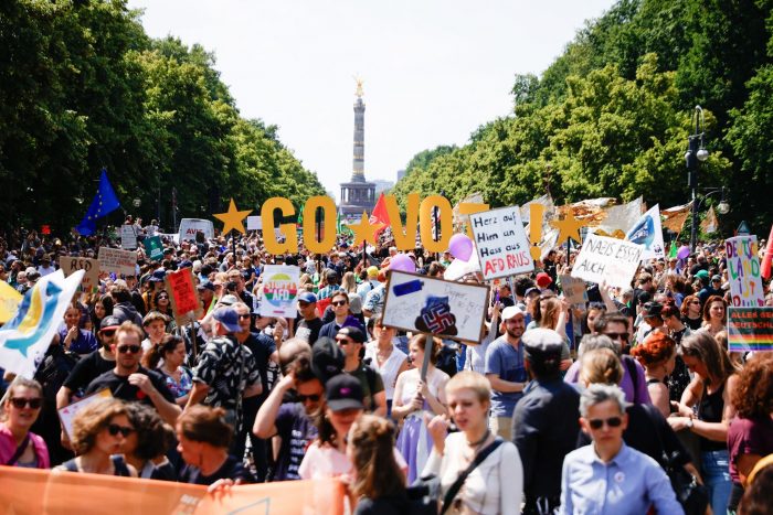 In verschiedenen Städten haben Menschen am Tag vor der Wahl gegen Rechtsextremismus demonstriert. Ein Bündnis zivilgesellschaftlicher Organisationen hatte dazu unter anderem in Berlin, Hamburg, München, Köln und Dresden aufgerufen. Laut Polizeiangaben versammelten sich allein in Berlin etwa 15.000 Menschen.