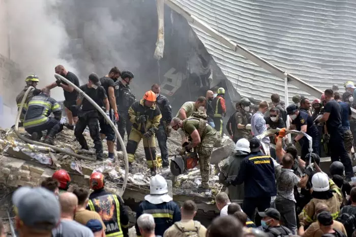 In Kiew war für heute ein Trauertag geplant. Die Rettungsarbeiten am großen Kinderkrankenhaus Ochmatdyt (Schutz von Mutter und Kind) mit seiner völlig zerstörten Fassade wurden nach über 24 Stunden eingestellt. Hunderte Retter, Mediziner und Freiwillige hatten bis zur Erschöpfung in den Trümmern nach Opfern gesucht. Am Montag saßen gerettete krebskranke Kinder an Infusionsgeräten auf dem Schoß ihrer Mütter auf der Straße. In der Klinik wurden zwei Erwachsene getötet, darunter eine Ärztin.