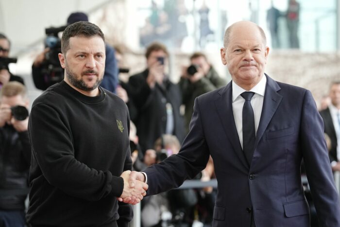 Der ukrainische Präsident würdigte die zuvor geschlossene bilaterale Sicherheitsvereinbarung und ein neu geschnürtes Paket für Militärhilfe, das weitere Haubitzen, Artilleriemunition, Luftverteidigungssysteme und Flugkörper vom Typ Iris-T beinhaltet. «Wir brauchen das genau jetzt», sagte er. Es handele sich um Waffen, die sein Land verzweifelt benötige. Leider gebe es einen Rückgang bei den Lieferungen anderer Partner. «Die deutsche Unterstützung ist lebenswichtig für uns, für unsere Kämpfer an der Front.»