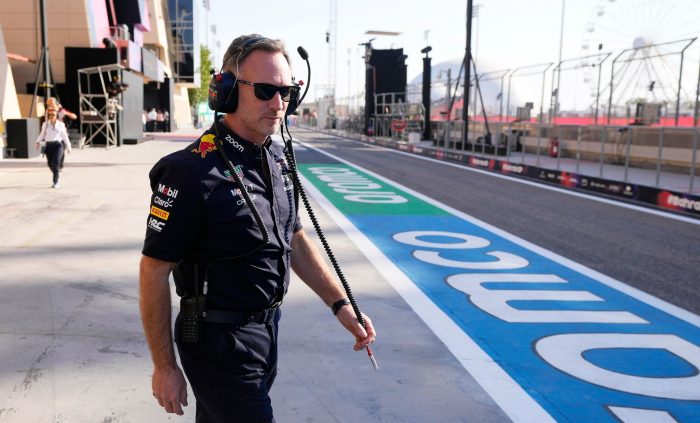Fotografen und TV-Teams haben sich vor dem sandfarbenen Pavillon von Red Bull im Formel-1-Fahrerlager von Bahrain positioniert. Im Mittelpunkt der Aufmerksamkeit stehen nicht wie üblich Triple-Weltmeister Max Verstappen, sondern erneut sein Teamchef Christian Horner.