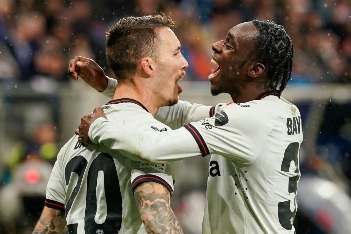 Europäische Späher beobachten Frimpong und Grimaldo bei Leverkusens Spiel in Baku. Beide auf dem Zettel der größten Clubs Europas.