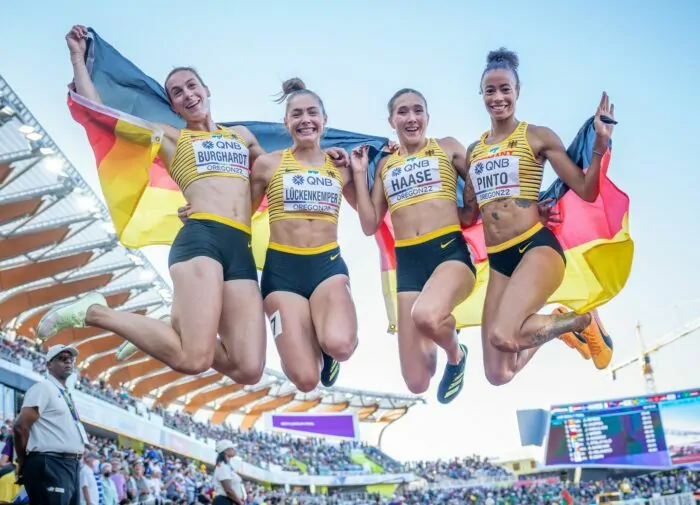 «Es fühlt sich an wie ein Traum gerade, ich hoffe, ich wache nicht auf», sagte Pinto. Nach acht trostlosen Tagen für die deutschen Athletinnen und Athleten mit nur einem Top-Acht-Resultat rauschte die Staffel über 4×100 Meter nach 42,03 Sekunden ins Ziel. Gold ging in 41,14 Sekunden überraschend an die US-Auswahl, die 0,04 Sekunden vor Jamaika um die 100-Meter-Weltmeisterin Shelly-Ann Fraser-Pryce und 200-Meter-Weltmeisterin Shericka Jackson ins Ziel kam. Dann folgte schon das deutsche Quartett – auch weil sich die britische Top-Läuferin und WM-Vierte Dina Asher-Smith direkt neben Lückenkemper laufend in der Zielkurve verletzte.