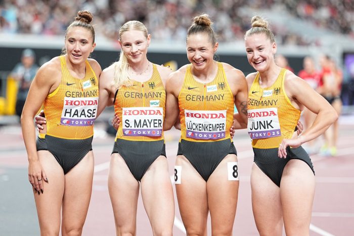 Die deutsche Frauen-Staffel über die 4×100 Meter hat bei den Leichtathletik-Weltmeisterschaften in Tokio Bronze gewonnen. Das Quartett mit Sina Mayer, Rebekka Haase, Sophia Junk und Gina Lückenkemper bejubelte in 41,87 Sekunden den dritten Platz und wiederholte damit den Bronze-Coup von Olympia in Paris vor gut einem Jahr.