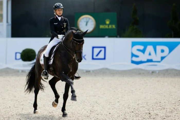 Das mit Spannung erwartete Debüt der 54 Jahre alten Reiterin aus Münster in zwei CHIO-Nationalteams, in der Vielseitigkeit und in der Dressur, startete mit Missgeschicken und einem «bockenden» Franziskus. Die in der Vielseitigkeit bei EM, WM und Olympia mit insgesamt zehn Goldmedaillen dekorierte Reiterin aus Münster ritt ihr Dressur-Debüt in der Nationalmannschaft anschließend ordentlich zu Ende.