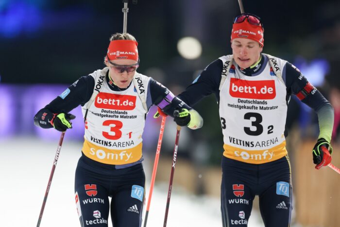 Er und die Olympiasiegerin beendeten das Biathlon-Jahr dennoch mit einem Lächeln, aber eben ohne Pokal. Den sicherten sich die Weltcup-Gesamtführende Julia Simon und Fabien Claude aus Frankreich. Auch das zweite Duo des Deutschen Skiverbandes (DSV) mit Vanessa Voigt und Philipp Nawrath hatte als Fünfter (1:03,5 Minuten Rückstand) nur die Zuschauerrolle bei der Siegerehrung inne. Doll und Herrmann-Wick überquerten direkt davor die Ziellinie mit 58,2 Sekunden Rückstand.