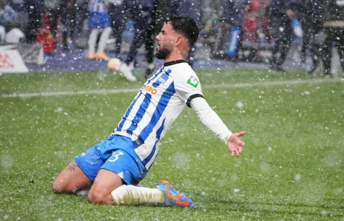 Im zur zweiten Halbzeit einsetzenden Schneetreiben versuchten die Gastgeber, sich mehr Spielanteile zu verschaffen, während sich die Gäste zunächst auf das Konterspiel beschränkten. Belohnt wurde das verbesserte Engagement der Berliner durch die Führung. Ein Freistoß von Kapitän Marvin Plattenhardt wurde vom ehemaligen Berliner Arne Maier mittig aus dem Strafraum zum bereitstehenden Richter geschossen, der aus 25 Metern ins rechte Eck traf. Der 25-Jährige hatte bereits im Hinspiel beim 2:0-Auswärtssieg getroffen und damals seinen ersten Treffer nach seiner Hodenkrebserkrankung feiern dürfen.