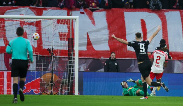 Nachdem der verstorbene Franz Beckenbauer geehrt wurde, hatte die Eintracht einen fantastischen Start. Die erste Chance im Spiel wurde von Knauf nach sieben Minuten zur Führung verwandelt. Niels Nkounkou flankte von halblinks flach herein, Mohamed Simakan konnte den Ball nicht erreichen, und Knauf knallte den Ball aus vollem Lauf aus fünf Metern in die Maschen. Es war das erste Mal, dass die Eintracht bei ihren bisherigen Auftritten in Leipzig in Führung ging. Genau zehn Minuten später vergab Benjamin Sesko, der den Vorzug vor Yussuf Poulsen bekam, nach einem Pass von Lois Openda den Ausgleich aus acht Metern.