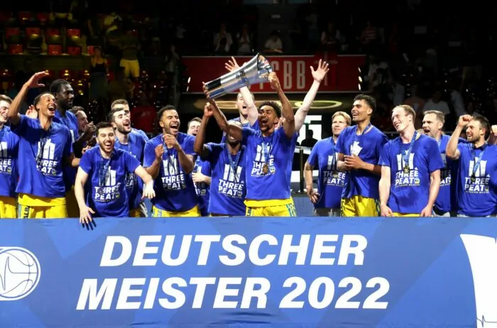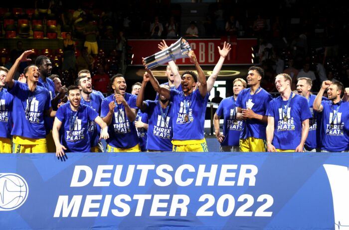 Der dritte Titel in Serie: Alba Berlin ist derzeit das Nonplusultra im deutschen Basketball. Manager Baldi ist zufrieden, die Spieler feiern erst in der Arena – und später auf dem Heimweg.