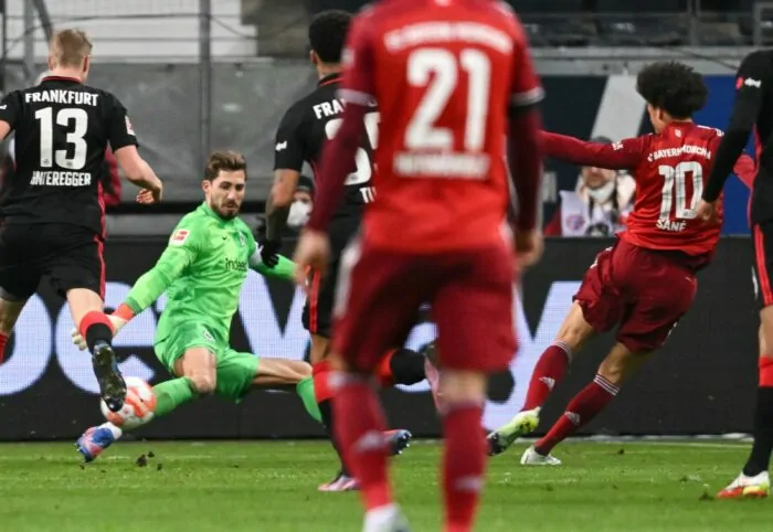 Dank des Tores von Joker Leroy Sané haben die Münchner Tabellenführer in der Fußball-Bundesliga einen weiteren großen Schritt Richtung Meisterschaft gemacht. Sané traf in der 71. Minute zum 1:0 (0:0)-Sieg des Rekordmeisters bei Eintracht Frankfurt. Der Vorsprung auf Verfolger Borussia Dortmund wuchs – zumindest für eine Nacht – auf neun Punkte. Der BVB ist am Sonntag beim FC Augsburg gefordert.