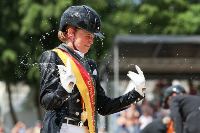 Nach den Fehlern am ersten Tag endete die deutsche Meisterschaft für Jessica von Bredow-Werndl mit spritzendem Champagner, einem Wasserbad und Doppel-Gold.