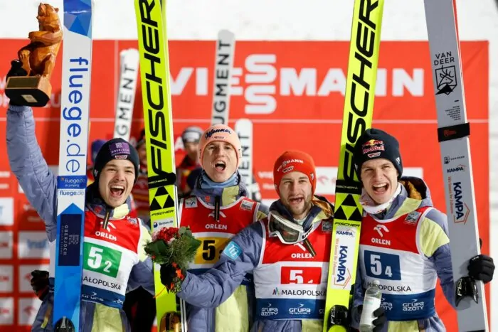 Das Siegerfoto um den schon wieder strahlenden Andreas Wellinger sah aus wie ein Familienbild. Platz eins für den Olympiasieger aus Bayern, die Ränge drei bis sechs für Karl Geiger, Markus Eisenbichler, Philipp Raimund und Constantin Schmid.