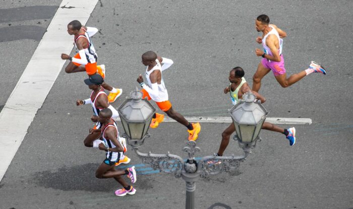 Zunächst sah es am Sonntag sogar so aus, als könnte er als Erster in einem offiziellen Rennen die Zwei-Stunden-Grenze unterbieten. Die erste Streckenhälfte absolvierte er in 59:51 Minuten, auf den zweiten gut 21 Kilometern konnte er dieses aberwitzige Tempo bei idealen äußeren Bedingungen aber nicht durchlaufen. Schon nach 25 Kilometern hatte er zudem keinen Tempomacher mehr und auch keinen Konkurrenten. Der Plan aber sei ein Streckenrekord, betonte Kipchoge. Hunderttausende von Zuschauern an der Strecke, die wieder für eine Stimmung wie vor der Corona-Pandemie sorgten, feuerten Kipchoge dafür an.