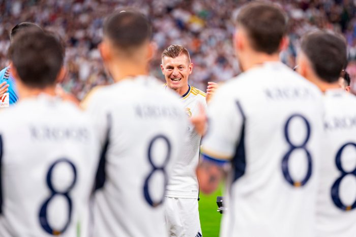 Vor dem Anpfiff standen die Profis des spanischen Fußball-Meisters Spalier für den 34-Jährigen, der seine überaus erfolgreiche Karriere nach der EM im Sommer beenden wird. Die Real-Stars trugen dabei Kroos‘ Trikot mit der Nummer acht. Die Fans im Estadio Santiago Bernabéu zeigten ein riesiges Banner mit der Aufschrift: «Gracias Leyenda» – Danke, Legende.