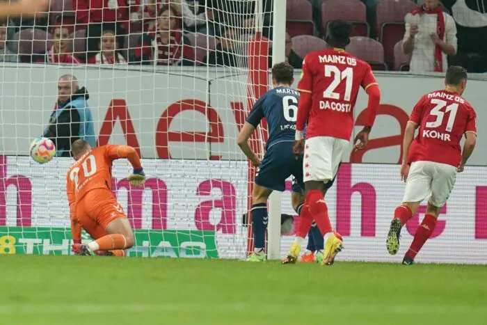 Bloß nicht wieder einem Rückstand hinterherlaufen, hatte Kölns Trainer Steffen Baumgart als Ziel ausgegeben. Doch die Hoffnung auf einen besseren Spielverlauf war vor 31.610 Zuschauern schnell dahin. Nachdem der Mainzer Onisiwo im Strafraum den Kölner Kilian kreuzte, kam es zum Kontakt. Ingvartsen ließ sich die Chance nicht nehmen und erzielte im vierten Pflichtspiel in Folge jeweils ein Tor. Womöglich war der Treffer aber nicht regelkonform. Beim Schuss hatte es ein wenig den Anschein, dass der Däne den Ball ganz leicht schon mit dem rechten Fuß berührt hatte. Eine Überprüfung der Szene gab es nicht mehr, sodass der FC im elften Spiel zum neunten Mal in Rückstand geriet.