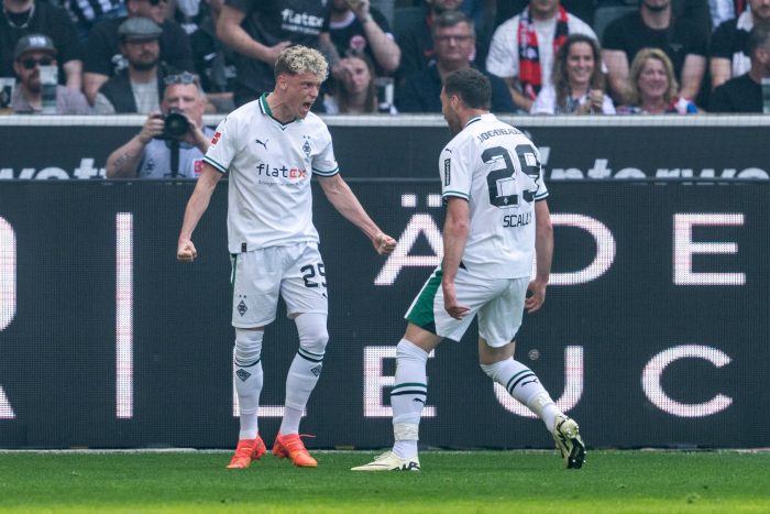 54.042 Zuschauer waren im ausverkauften Borussia-Park, als der formstarke Robin Hack (9. Minute) die Gladbacher erneut in Führung brachte. Ein grober Fehler von Abwehrspieler Nico Elvedi führte noch vor der Halbzeit zum Ausgleich durch Dina Ebimbe (35.). Das leistungsgerechte 1:1 blieb bis zum Schluss bestehen. Mit 34 Punkten bleibt das Team von Trainer Gerardo Seoane auf dem 13. Tabellenplatz. Ein Sieg hätte der Eintracht den sechsten Platz sichern können. Die Frankfurter feierten zwar in Mönchengladbach mit ihren Fans, könnten aber theoretisch noch von Hoffenheim überholt werden.