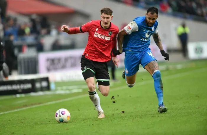 Gleichzeitig zieht Hannover 96 auch mit den Aufstiegsplätzen gleich. Nach dem 2:1 (1:1) gegen den Abstiegskandidaten Hansa Rostock haben die Niedersachsen genauso viele Punkte wie Düsseldorf und Paderborn. Rostock bleibt mit dem Vorletzten Braunschweig punktgleich auf dem 16. Platz. Der ehemalige Nationalspieler Marcel Halstenberg erzielte das entscheidende Tor für Hannover (78.) und wurde dann wegen einer Tätlichkeit in der 89. Minute vom Platz gestellt.
