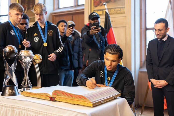 Nach dem feierlichen Empfang in der Heimat ging es für die Gold-Jungs der U17-Auswahl zurück in den Alltag. «Ich mache dieses Jahr Abi. Deshalb muss ich am Dienstag in den Mathe-Unterricht», erzählte Eric Emanuel da Silva Moreira vom FC St. Pauli bei der kleinen Party im DFB-Campus.