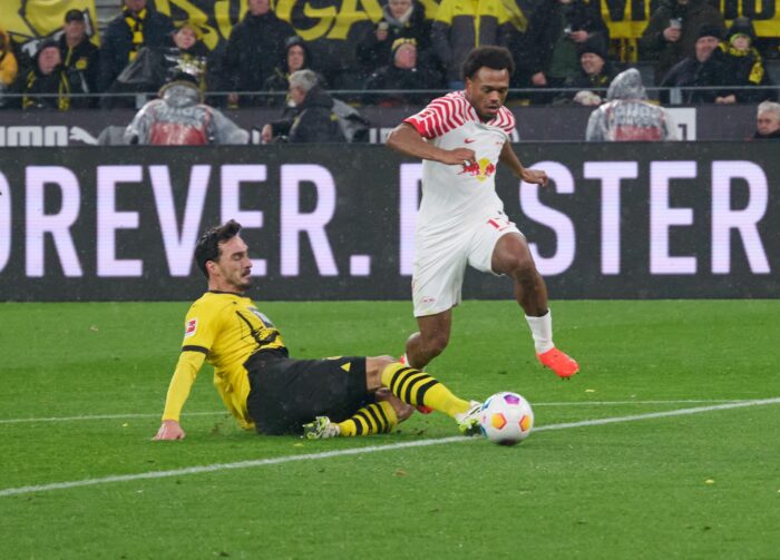 Dieser Platzverweis hinterließ sichtbare Wirkung. Leipzig erhöhte umgehend das Tempo und kam durch Simakan (19.) und Haidara (21.) zu ersten Chancen. Das schnelle Kombinationsspiel brachte die Dortmunder Abwehr auch in den folgenden Minuten gehörig ins Wanken. Weil es dem BVB in Unterzahl zunächst nicht gelang, mit Offensivaktionen für Entlastung zu sorgen, nahm der Druck stetig zu. Der Rückstand schien nur eine Frage der Zeit. Es passte ins Bild der kriselnden Borussia, dass er durch ein Eigentor zustande kam. Nach Ecke des Leipzigers David Raum köpfte Bensebaini den Ball ins eigene Tor.