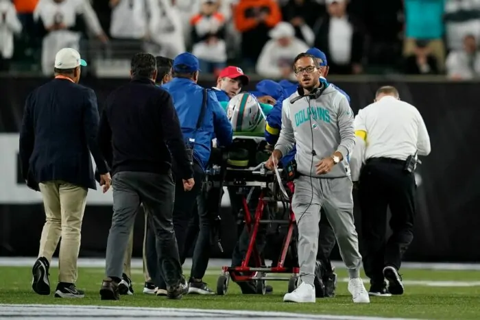 Der Spielmacher der Miami Dolphins war im Duell mit den Cincinnati Bengals zu Boden gerissen worden und dabei hart mit dem Kopf auf dem Feld aufgekommen. Er wurde minutenlang behandelt und dann mit einer Trage vom Feld gebracht. Die Dolphins gaben wenige Minuten später bekannt, der 24-Jährige könne die Partie wegen «Kopf- und Nackenverletzungen» nicht fortsetzen. «Tua Tagovailoa wurde für weitere Untersuchungen in ein lokales Krankenhaus gebracht. Er ist bei Bewusstsein und kann alle Extremitäten bewegen.» US-Medien berichteten unmittelbar nach Spielende, Tagovailoa werde noch am Abend aus dem Krankenhaus entlassen und werde mit dem Team nach Miami reisen.