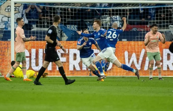 Der fulminante Schlussspurt der Schalker verwandelte das Stadion in ein Tollhaus. Begleitet von den Gesängen ihrer Fans feierten die Profis von Trainer Thomas Reis das mit Herz, Willen und Glück erkämpfte 2:1 (0:1) über Werder Bremen fast so überschwänglich wie einen bereits gesicherten Klassenverbleib.