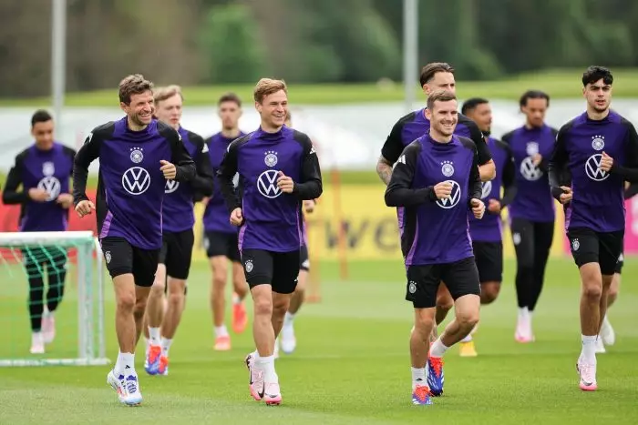 Automatismen ließ Nagelsmann auch auf dem Trainingsplatz einstudieren – unter erschwerten Bedingungen. So kräftig prasselte der Regen hernieder, dass sich Andrich von dem meteorologischen Tiefdruckgebiet ein wenig verfolgt fühlte. «Wir sind aus dem Regen losgeflogen und in den Regen rein», sagte er. Standards, ein möglicherweise entscheidender EM-Faktor, standen auf dem Programm. Und immerhin hatte der Bundestrainer nach der Ankunft des Bayer-Trios und von Kapitän Ilkay Gündogan erstmals 24 Spieler auf dem Platz.
