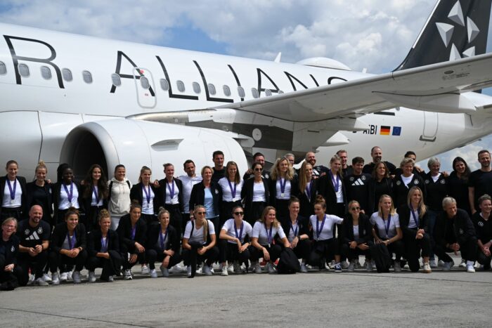 Schon bei der Landung in Frankfurt wurde der gesamte DFB-Tross herzlich begrüßt. Als erste stieg Voss-Tecklenburg aus dem Flieger, gefolgt von Kapitänin Alexandra Popp, die im Endspiel verletzt zuschauen musste. Später trugen sich die Spielerinnen und die Bundestrainerin im Römer ins Goldene Buch der Stadt ein. Frankfurts Stadtrat Mike Josef dankte der Mannschaft dafür, dass sie «uns Werte zurückgegeben hat, die sehr wertvoll sind: Kampfgeist, Teamgeist, Freude und Spaß».