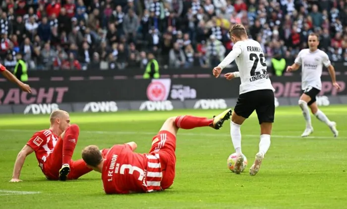 Schon der erste gelungene Angriff der Hessen führte zum Erfolg. Kolo Muani setzte an der Mittellinie zu einem unwiderstehlichen Solo an und passte den Ball dann von der Grundlinie in den Rücken der Abwehr auf den frei stehenden Götze, der überlegt ins lange Eck verwandelte. Union-Torwart Frederik Rönnow, der von 2018 bis 2021 bei der Eintracht unter Vertrag stand, war machtlos.