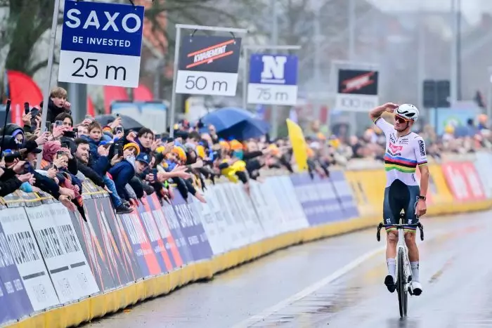 Jedoch kehrte der belgische Vorjahressieger zurück und folgte ihm. Van Aert verringerte zwar den Rückstand auf fast zehn Sekunden, aber der Niederländer eilte davon. Knapp zwölf Kilometer vor dem Ziel baute van der Poel den Abstand auf eine Minute aus.