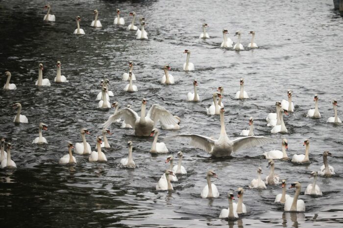 Das Spektakel wurde dabei entlang der Strecke sowie an der Rathausschleuse von vielen Schaulustigen beobachtet. Schwanenvater Olaf Nieß und sein Team begleiteten die Schwäne mit Booten aus dem Quartier.