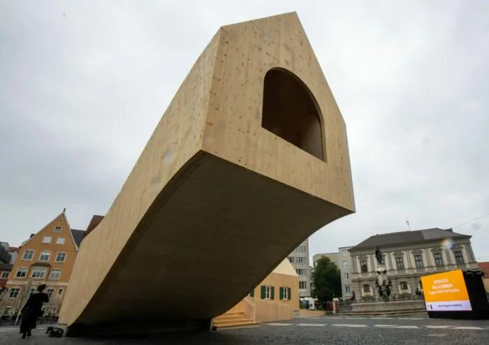 Der Holzpavillon vor dem Rathaus soll nach der Veranstaltungsreihe an anderer Stelle in Augsburg wieder aufgehaut werden. Das eine Ende dieses Pavillons schwebt etwa drei Meter über der Erde und verleiht dem Gebäude so ein besonderes Aussehen.