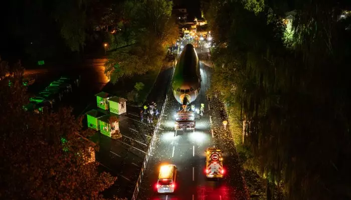 Die Strecke für den Transport führte über eine Distanz von etwa 1,8 Kilometern durch das Landschaftsschutzgebiet. Das Absenken des Rumpfes von 6,80 Metern auf 5,90 Meter sollte Schäden an Bäumen vermeiden. Die abgebauten Tragflächen und das Höhenleitwerk wurden bereits zuvor in den Park gebracht.