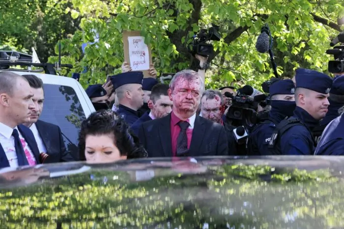 In Polen haben Demonstranten Russlands Botschafter mit roter Flüssigkeit attackiert und daran gehindert, Blumen auf einem Friedhof für sowjetischen Soldaten niederzulegen.
