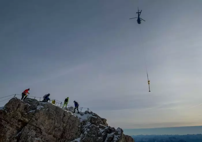 Wenn die ersten Skifahrer am Gipfel aus der Gondel der Zugspitzbahn steigen, wird das goldene Kreuz per Helikopter in 2.962 Metern Höhe dorthin geflogen. Zuvor wird ein Lastwagen das 4,88 Meter große und 300 Kilogramm schwere Stück aus der Werkstatt der Kunstschmiedin Andrea Würzinger in Eschenlohe zum Startplatz am Fuß der Zugspitze bringen. Würzinger hat gut zwei Wochen daran gearbeitet – eine echte Herausforderung, auch wegen der Größe des Kreuzes, sagt sie.