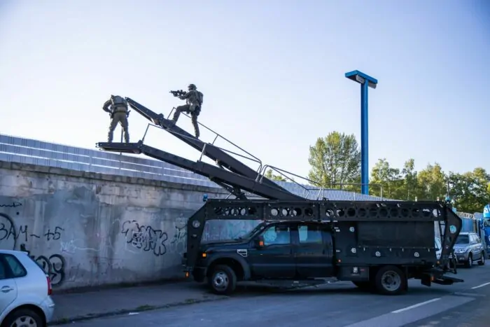 Am Dienstagabend waren mehrere hundert Einsatzkräfte ausgerückt – darunter wegen vermuteter Gewaltbereitschaft und Waffenbesitz der Verdächtigen auch Spezialkräfte (SEK). Sie haben bis in die Nacht zum Mittwoch elf Objekte (drei Gewerbeobjekte, acht Wohnungen) in Essen und Gelsenkirchen durchsucht. Auch ein Spezialfahrzeug mit einer ausfahrbaren Rampe zum Überwinden einer Mauer wurde vom SEK eingesetzt, wie Bilder zeigen.