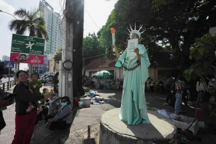 Am Dienstag wartete Theary Seng vor dem Gerichtsgebäude als Freiheitsstatue verkleidet auf das Urteil. Medien zitierten sie mit dem Worten, sie wolle, dass ihre Verhaftung im Licht der Öffentlichkeit geschehe. Seng hatte schon als Kind ihre Eltern unter der blutigen Herrschaft der Roten Khmer verloren. Bis zum Abschluss ihres Studiums lebte sie in den USA.