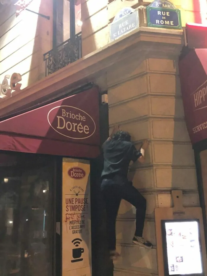 An einer längst geschlossenen Wechselstube etwa strahlt die blaue Reklame in die Nacht. Einer der Sportler springt in die Höhe und erreicht den eigentlich für die Feuerwehr in Notfällen gedachten Schalter im ersten Anlauf. Das war einfach, ähnlich schnell wird es dunkel im Schaufenster eines Brautmodengeschäfts. Unter der Anleitung ihrer Kameraden auf dem Bürgersteig hangelt sich die junge Frau dann an der Fassade eines Herrenausstatters hoch, bei dem noch Licht brennt. «Ich trainiere Klettern in der Halle und draußen Parkour», erzählt sie. Alle paar Wochen sei sie auch bei der nächtlichen Runde durch Paris dabei.