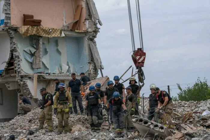 Neben den 15 Toten wurden bis zum späten Sonntagabend auch sechs Verletzte aus dem Wohnhaus in dem Ort im Donezker Gebiet geborgen, wie der stellvertretende Leiter des Präsidentenbüros, Kyrylo Tymoschenko, mitteilte. Noch immer würden 23 Menschen vermisst.