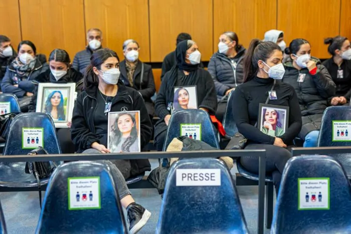Familienangehörige mit Porträts der Getöteten im Gericht