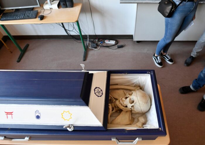 Schüler im Eifel-Ort Schleiden haben ein viele Jahre im Biologieunterricht genutztes menschliches Skelett beerdigt. Die Schülerinnen und Schüler des Johannes-Sturmius-Gymnasiums trugen den Sarg mit den Knochen aus dem Biologiesaal zum nahe gelegenen evangelischen Friedhof.