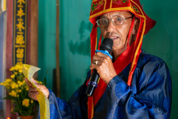 Co leitet eine Gruppe von Wal-Worshippern, die auf der Insel zu den Geistern der Meeressäuger beten und sie um einen guten Fang und Schutz auf See bitten. Denn für viele Vietnamesen sind Wale heilige Tiere. Sie betrachten sie als schützende Gottheiten, die in den Tiefen des Pazifiks leben. Wenn Fischer bei einem Unwetter einen der Giganten sichten, wird dies als gutes Omen gewertet: Sie werden die Gefahr überstehen.