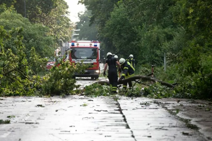 In mehreren Städten waren die Feuerwehren im Dauereinsatz – etwa wegen umgekippter Bäume, unter Wasser stehender Keller und Straßen. Bei der Deutschen Bahn kam es wegen der Folgen des Unwetters zu Ausfällen und Streckensperrungen. Der Deutsche Wetterdienst hatte vor der Gewitterfront mit Starkregen gewarnt.
