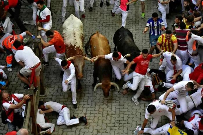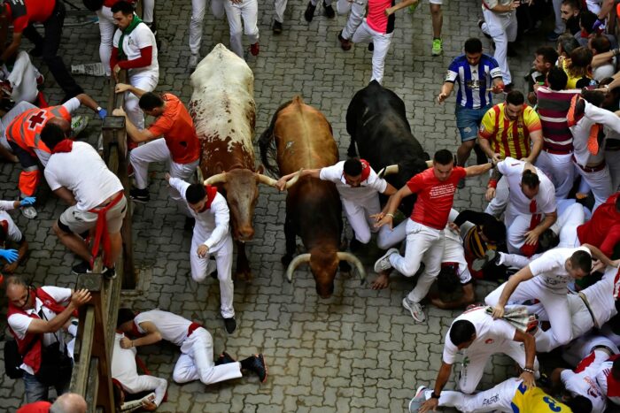 An insgesamt acht Tagen wurden auch diesmal am frühen Vormittag jeweils sechs zum Teil über 600 Kilogramm schwere Kampfbullen und mehrere zahme Leitochsen durch die engen Gassen der Altstadt für die Stierkämpfe am Abend bis in die Arena gejagt.