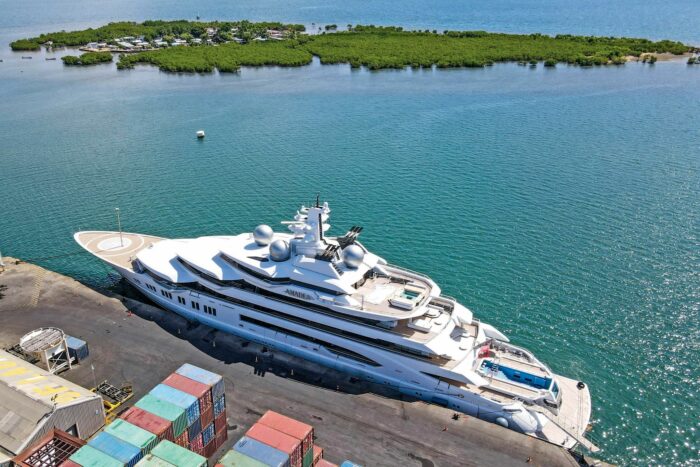 Wegen der unklaren Besitzverhältnisse ist die Luxusjacht – nach einer 18-tägigen Fahrt von Mexiko quer über den Pazifik – seit Mitte April im unluxuriösen Containerhafen von Lautoka auf Fidschi gestrandet.