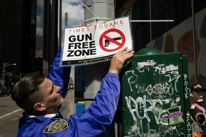 Der Kongress des Bundesstaats New York hatte Anfang Juli ein Gesetz verabschiedet, wonach Menschen an vielen öffentlich zugänglichen Orten solche Waffen nicht mehr tragen dürfen, darunter Regierungsgebäude, Büchereien, Gesundheitseinrichtungen, Parks, U-Bahnen und wichtige öffentliche Plätze wie Times Square. Zuvor hatte bereits jahrzehntelang eine ähnliche Vorschrift gegolten, der Oberste Gerichtshof der USA hatte diese aber für ungültig erklärt.